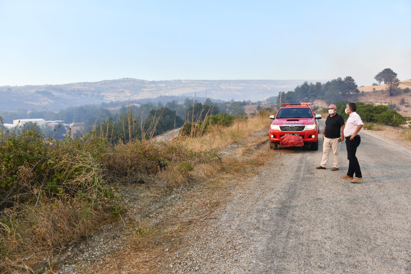 Belediye Başkan Vekili M. İrfan Mutluay, Damyeri mevkiinden başlayarak kısa sürede yayılan yangınla mücadele çalışmalarını inceledi.