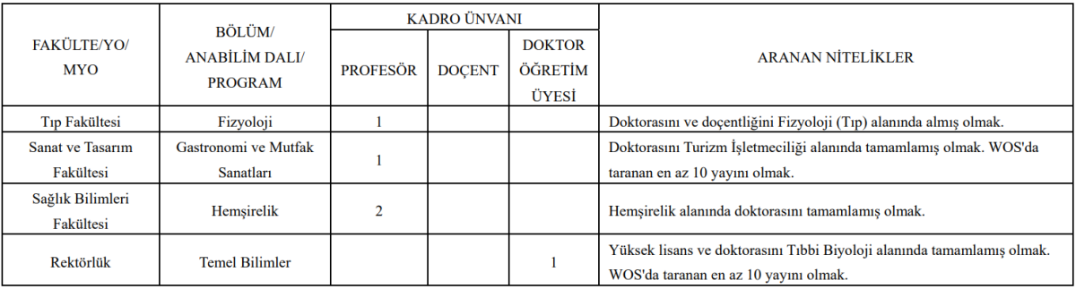 Rektörlük bünyesinde Temel Bilimler alanında 1 öğretim üyesi alımı yapılacak. Adayların Tıbbi Biyoloji alanında yüksek lisans ve doktora derecelerini tamamlamış olmaları ve WOS’da taranan en az 10 yayına sahip olmaları şartı bulunuyor.