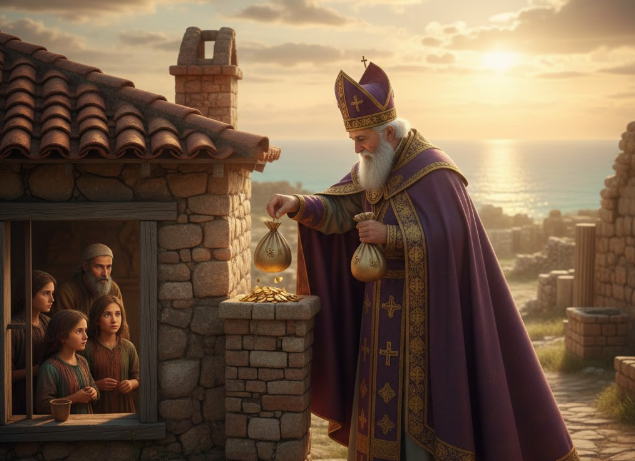 Hikaye: Rivayete göre, Myra'da yaşayan yoksul bir adamın evlenecek çağa gelmiş üç kızı vardı, ancak çeyizleri olmadığı için kızlar kötü bir kaderle yüzleşmek üzereydi.