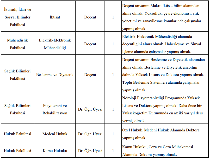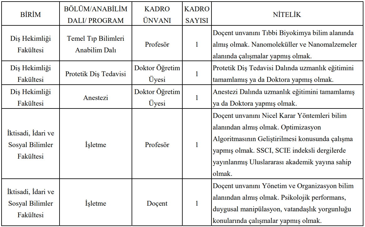 Üniversite, çeşitli fakültelerde toplamda 11 öğretim üyesi alımı yapacak. İşte fakültelere göre kadro detayları: