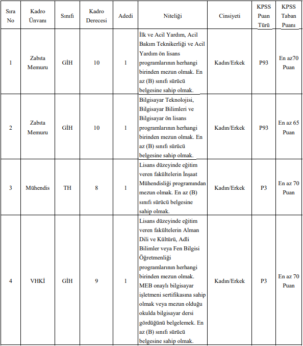 Zabıta Memuru (1 Kişi): İlk ve Acil Yardım, Acil Bakım Teknikerliği gibi ön lisans programlarından mezun, en az 70 KPSS (P93) puanı olan adaylar.