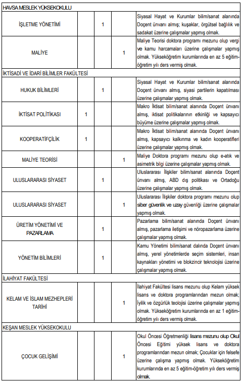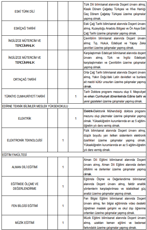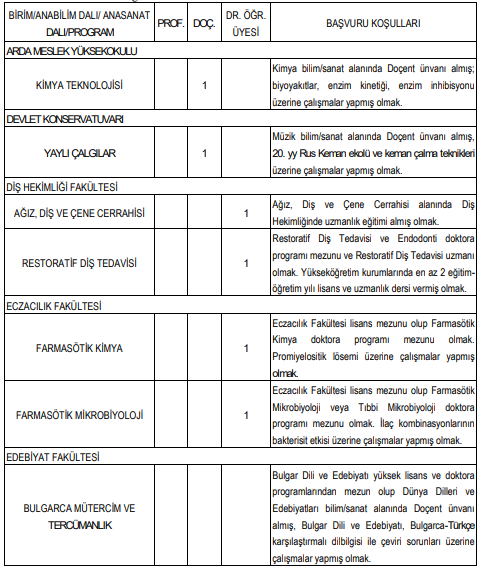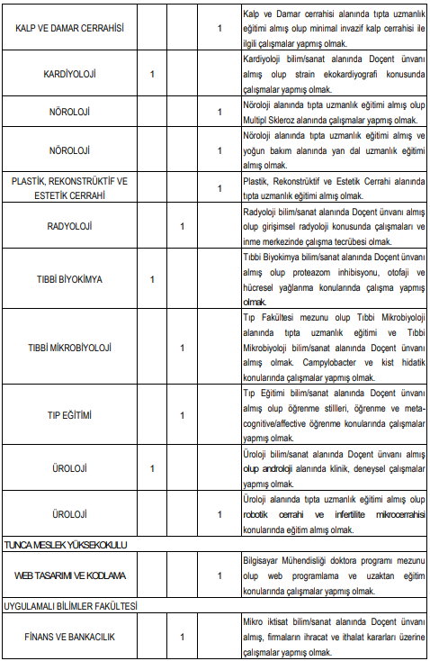 Trakya Üniversitesi’nin yayımladığı ilana göre öğretim üyesi alımı yapılacak birimlerden bazıları şunlar: