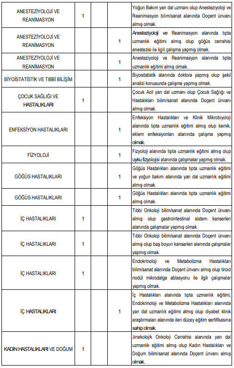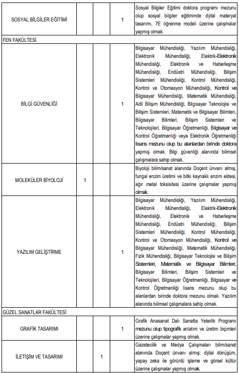 Adaylardan, ilan edilen her kadro için alana özgü bilimsel çalışmalar, uzmanlık alanları ve akademik deneyim şartları aranıyor.