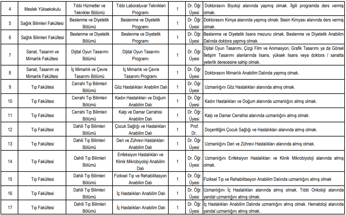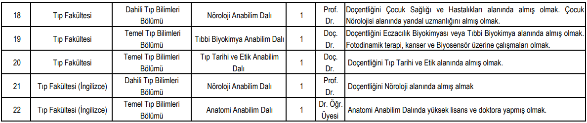 Ayrıca Temel Tıp Bilimleri Bölümü bünyesinde Tıbbi Biyokimya ve Tıp Tarihi ve Etik anabilim dalları için doçent kadroları açıldı. Fotodinamik terapi, kanser ve biyosensör alanlarında çalışmaları bulunan adaylar için özel şartlar ilan metninde yer aldı.
