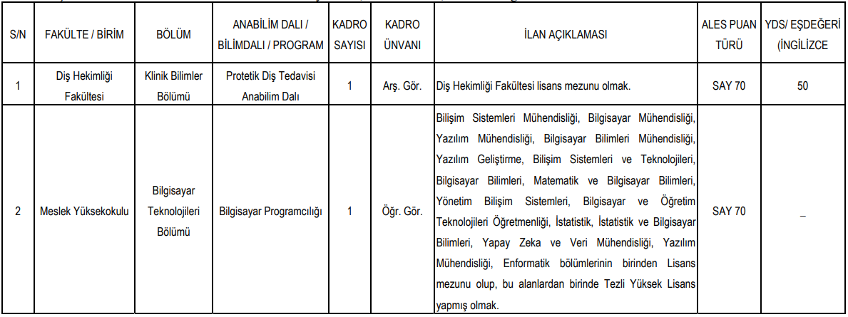 Üniversite tarafından yayımlanan ikinci ilan kapsamında ise öğretim üyesi dışındaki öğretim elemanı kadrolarına alım yapılacağı duyuruldu. Araştırma Görevlisi ve Öğretim Görevlisi pozisyonları için başvurular yine 15 gün içinde alınacak. Bu kadrolar için ALES puanı, yabancı dil şartı ve sınav takvimi ilan metninde ayrıntılı olarak belirtildi.