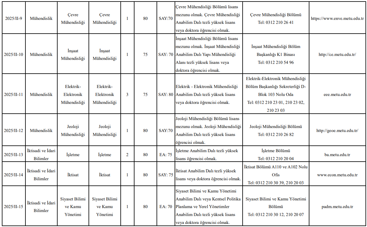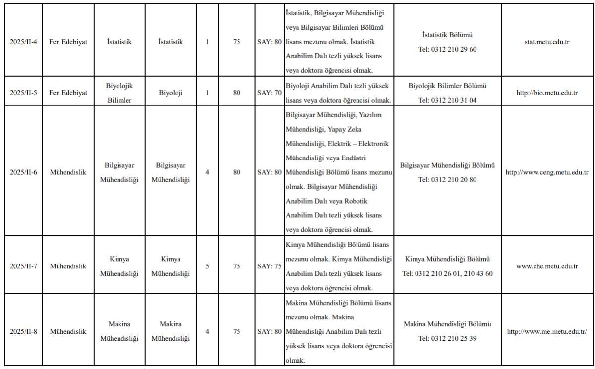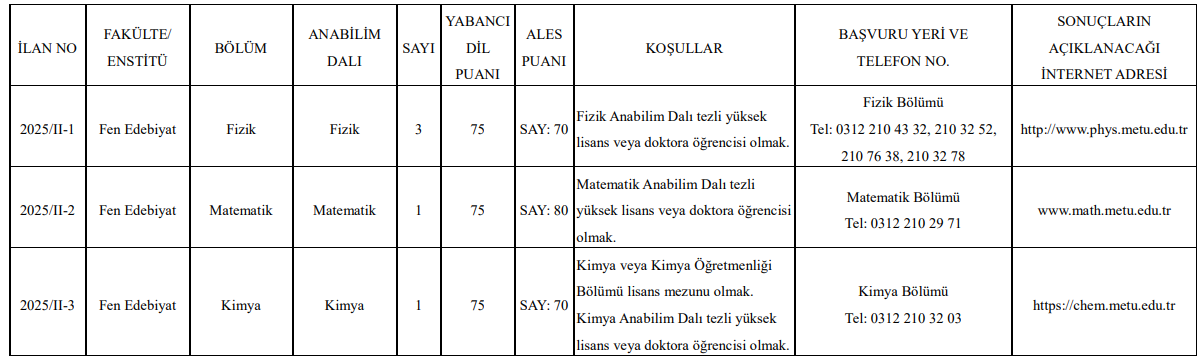 Orta Doğu Teknik Üniversitesi (ODTÜ) Rektörlüğü, 2547 sayılı Yükseköğretim Kanunu ve ilgili yönetmelikler doğrultusunda üniversite bünyesinde çeşitli akademik birimlerde araştırma görevlisi kadroları için başvuru sürecini başlattı. İlan kapsamında Fen, Mühendislik, İktisadi ve İdari Bilimler, Mimarlık ve Enformatik bölümlerinde toplam 35’in üzerinde kadro açıldı.