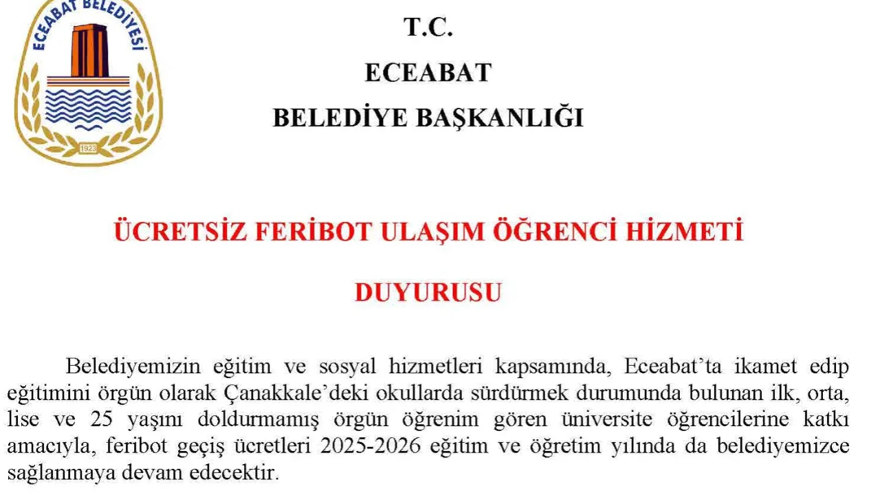 Belediye tarafından yapılan duyuruda; ilkokul, ortaokul, lise ve 25 yaşını doldurmamış üniversite öğrencilerinin feribot geçiş ücretlerinin karşılanacağı bildirildi. Uygulamanın, öğrencilerin ulaşım giderlerini hafifletmek ve eğitime katkı sunmak amacıyla devam ettirileceği belirtildi.