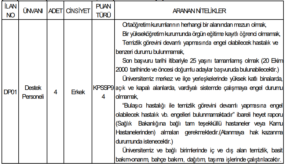 İlan kapsamında alınacak personel detayları şu şekilde açıklandı: