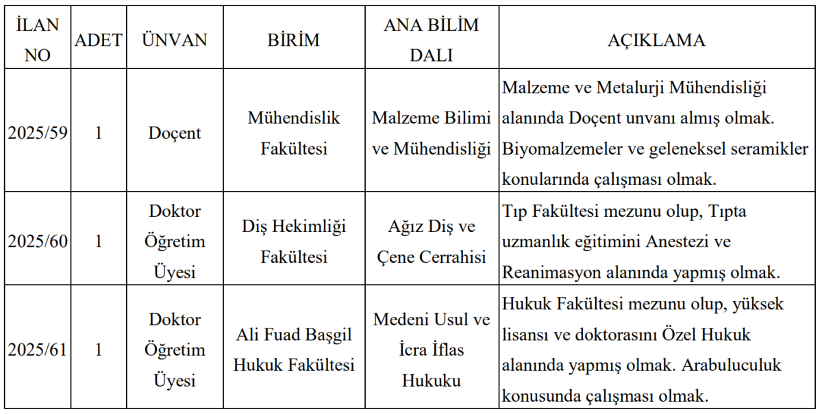 OMÜ’nün yayımladığı ilanda üç farklı fakülte için üç öğretim üyesi kadrosu bulunuyor: