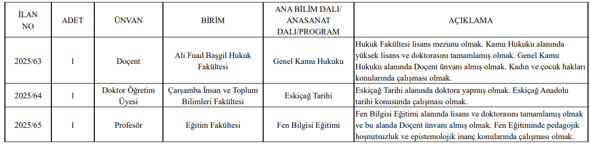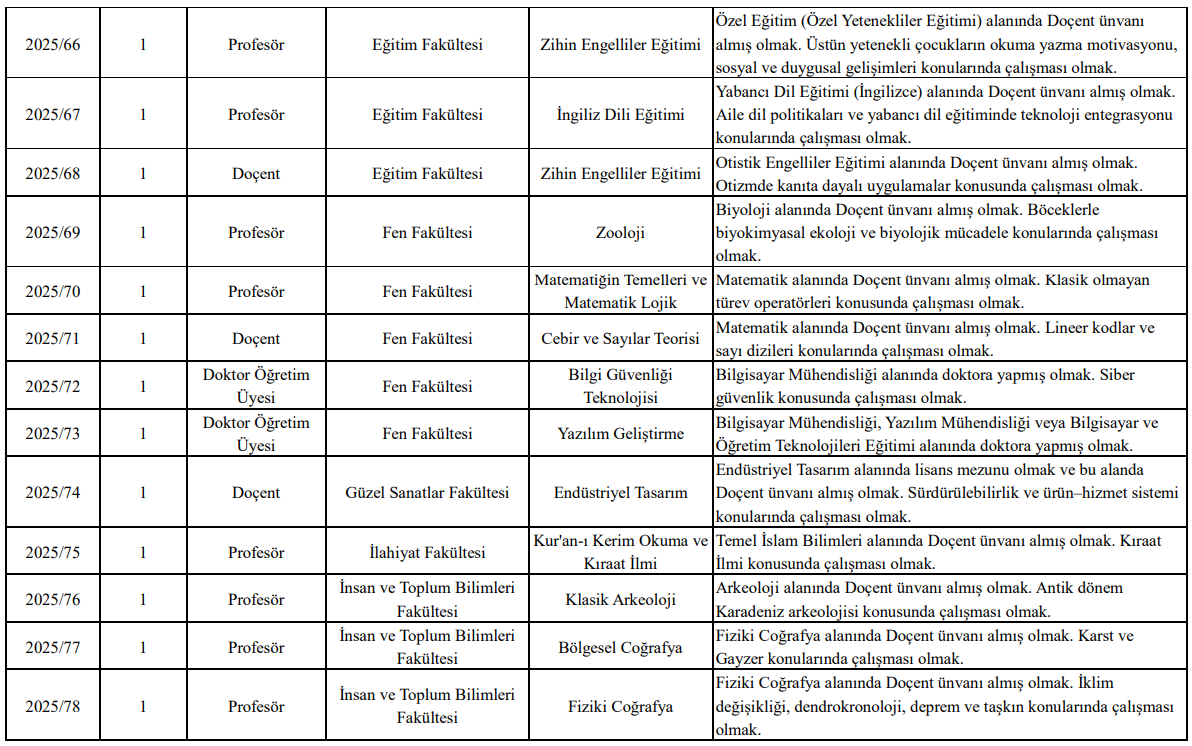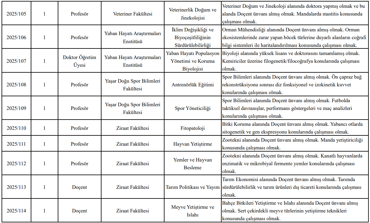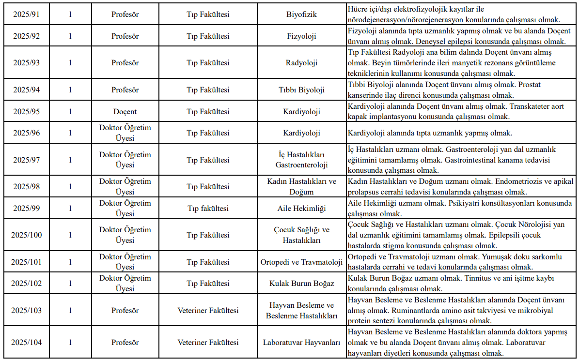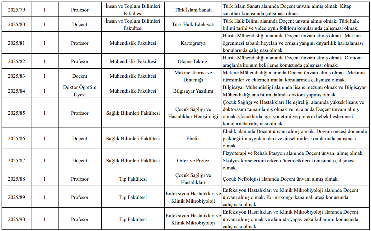 İlan kapsamında birçok alanda uzmanlık gerektiren akademik kadrolar yer alıyor. Hukuk, eğitim bilimleri, mühendislik, fen bilimleri, tıp, veterinerlik, ziraat, spor bilimleri ve sanat alanlarında açılan kadrolar dikkat çekiyor.