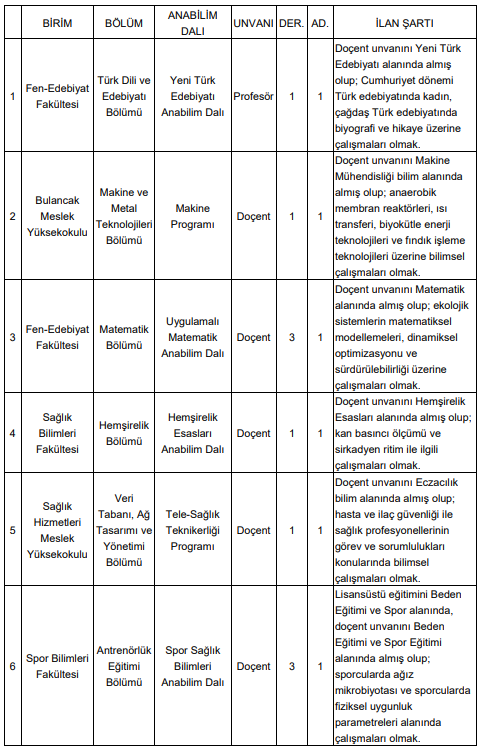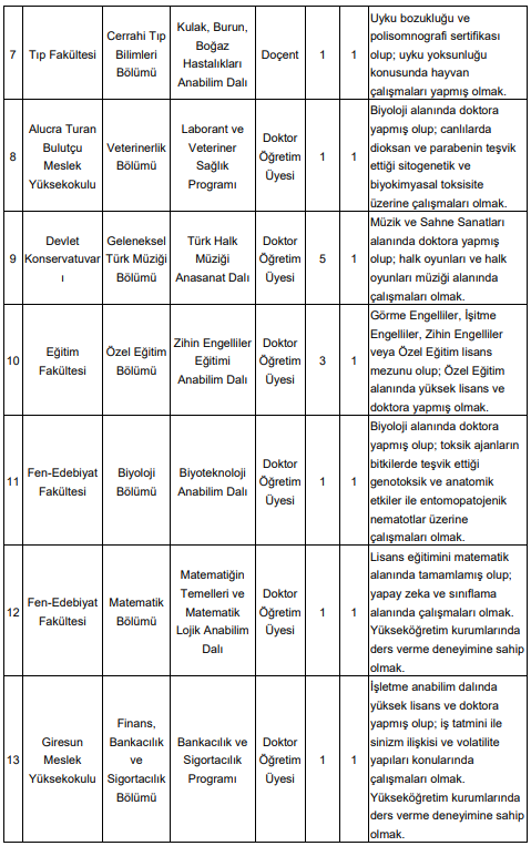 Profesör Kadroları: Profesör adayları, başvurdukları birim, bölüm ve anabilim dalını belirten başvuru formlarıyla birlikte özgeçmiş, 2 adet fotoğraf, nüfus cüzdanı fotokopisi, lisans, yüksek lisans ve doktora belgeleri, doçentlik belgesi, EK-2 yayın listesi ve puanlama tablosu, EK-3 Genel Değerlendirme tablosu ve bilimsel çalışmalarını kapsayan 1 adet fiziki dosya ile 6 adet USB belleği Giresun Üniversitesi Personel Dairesi Başkanlığı’na teslim etmek zorunda.