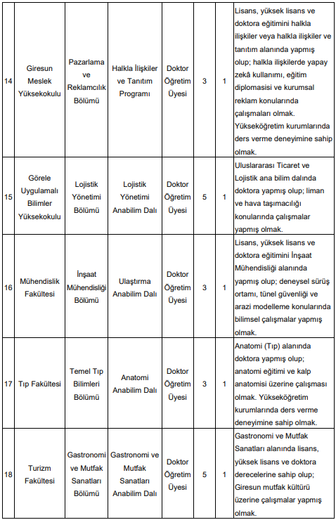 Giresun Üniversitesi Rektörlüğü, üniversite bünyesindeki birimlerde istihdam edilmek üzere öğretim üyeleri ve akademik personel alım ilanını duyurdu. İlan, 2547 sayılı Yükseköğretim Kanunu, 657 sayılı Devlet Memurları Kanunu ve Giresun Üniversitesi Öğretim Üyeliğine Yükseltilme ve Atanma Yönergesi hükümleri çerçevesinde gerçekleştiriliyor. Üniversite, profesör, doçent ve doktor öğretim üyesi kadroları için başvuruları kabul edecek.