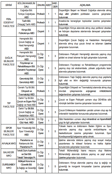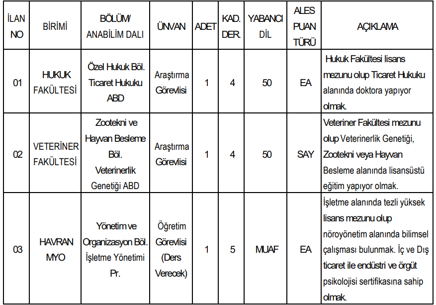 Havran Meslek Yüksekokulu İşletme Yönetimi Programı için 1 Öğretim Görevlisi alınacaktır. Adayların İşletme alanında yüksek lisans derecesine sahip olmaları ve ilgili sertifikaları bulundurmaları gerekmektedir.