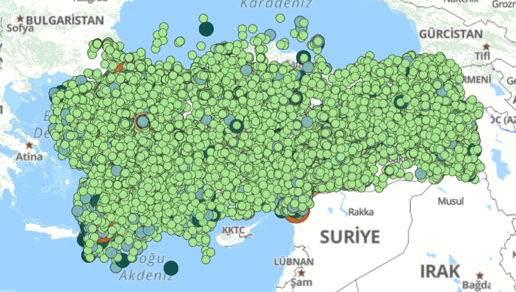 2023 yılında meydana gelen depremleri gösteren bir harita. Ülkemizin her karış toprağında toplam 155 bin depqrem meydana gelmiş.