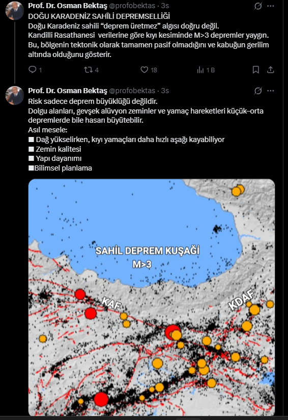 Doğu Karadeniz sahilinin tamamen güvenli olduğu yönündeki yaygın kanaat, paylaşılan veriler ışığında yeniden tartışılıyor. Sismik kayıtlar, uydu ölçümleri ve arazi gözlemleri birlikte değerlendirildiğinde, bölgenin tektonik olarak tamamen pasif olmadığı görülüyor.