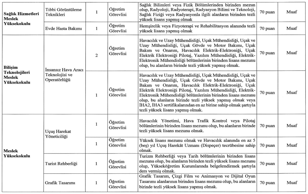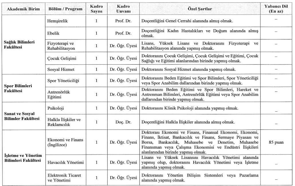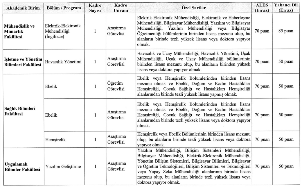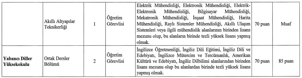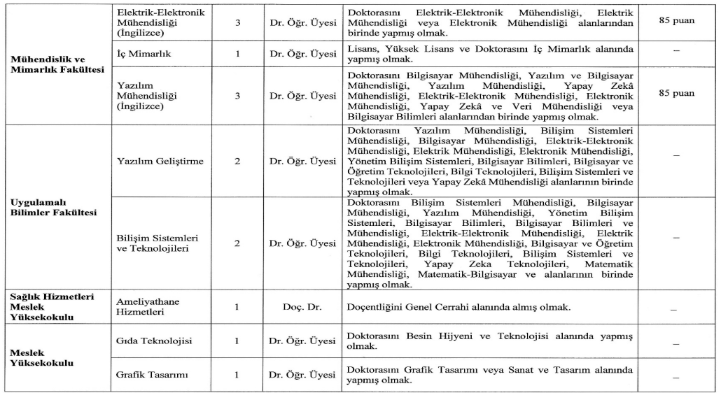 Üniversitenin ilanına göre, öğretim üyesi dışındaki öğretim elemanı kadroları için de alım yapılacak. Bu kadrolara başvuracak adayların 2547 sayılı Yükseköğretim Kanunu ve ilgili yönetmelik uyarınca şartları yerine getirmesi gerekiyor.