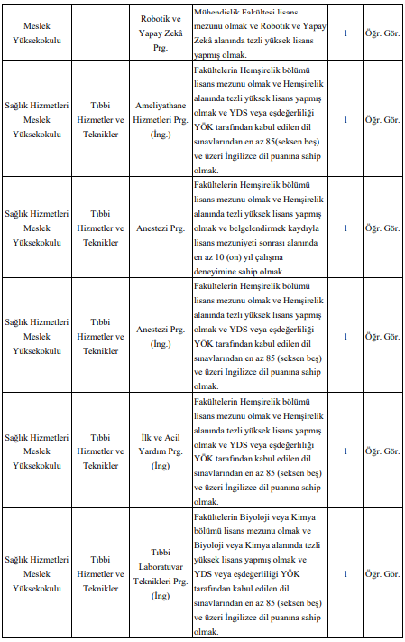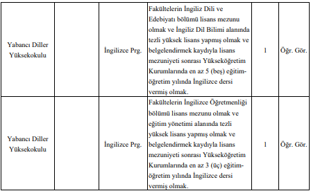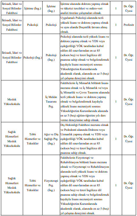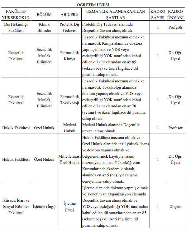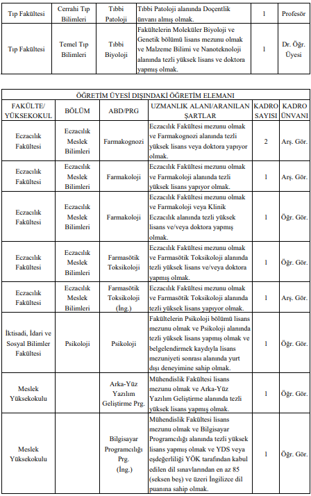 kadrolarına alım yapılacağı bildirildi. Kadro dağılımı, başvuru yapılabilecek akademik birimler ve özel şartlara ilişkin ayrıntılı bilgiler üniversitenin internet adresinde yer alıyor.
