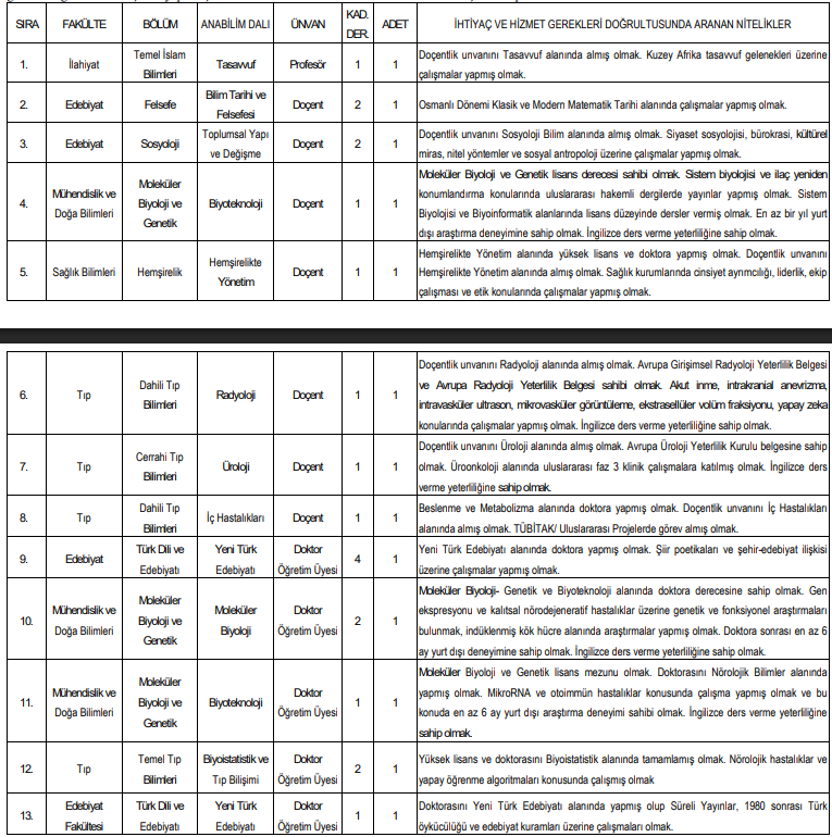 Profesör kadrolarına başvuracak adayların, 2547 sayılı Kanun’un 26’ncı maddesi ile 657 sayılı Devlet Memurları Kanunu’nun 48’inci maddesinde belirtilen şartları taşıması gerekiyor. Profesör kadroları daimi statüde olacak.