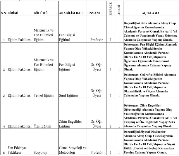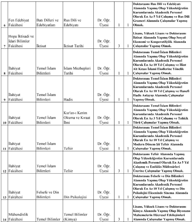olarak sıralanıyor. Kadrolar, üniversitenin ihtiyaç duyduğu bölüm ve anabilim dallarında açılmış olup, adayların başvuru dilekçelerinde başvurdukları bölüm ve anabilim dalını açıkça belirtmeleri gerekiyor.