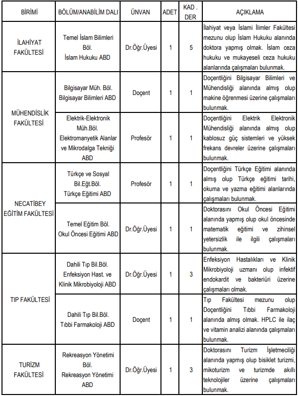 Balıkesir Üniversitesi’nin ilanında öne çıkan bazı kadrolar şunlar oldu:
