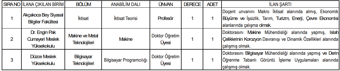Düzce Üniversitesi Rektörlüğü, 2547 sayılı Kanun ve ilgili yönetmelikler doğrultusunda çeşitli fakülte, yüksekokul ve meslek yüksekokullarında görevlendirilmek üzere öğretim üyesi alacağını duyurdu. Resmî ilan kapsamında profesör, doçent ve doktor öğretim üyesi kadroları için toplam 47 pozisyon açıldı. Adayların devlet hizmetine girişte aranan genel şartlara sahip olmaları gerektiği belirtildi.