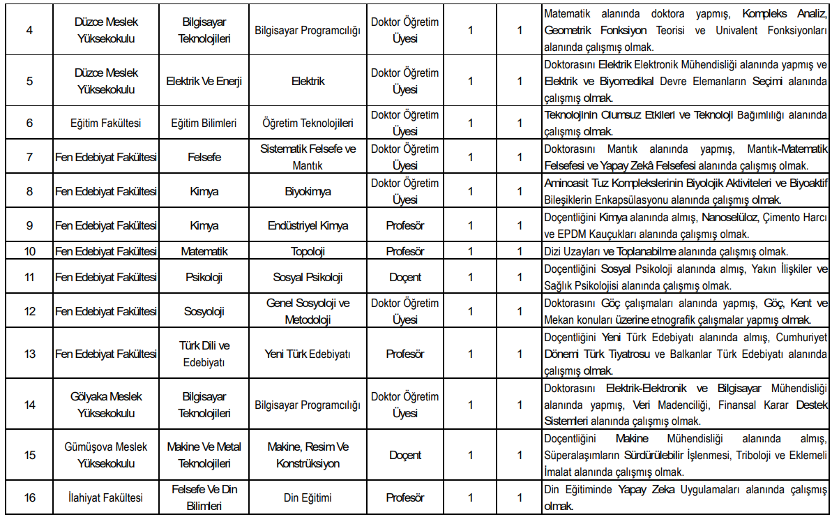 Kimya, matematik, psikoloji, sosyoloji, Türk dili ve edebiyatı, felsefe gibi bölümlerde profesör, doçent ve doktor öğretim üyesi kadroları açıldı. Aranan çalışma alanları arasında: