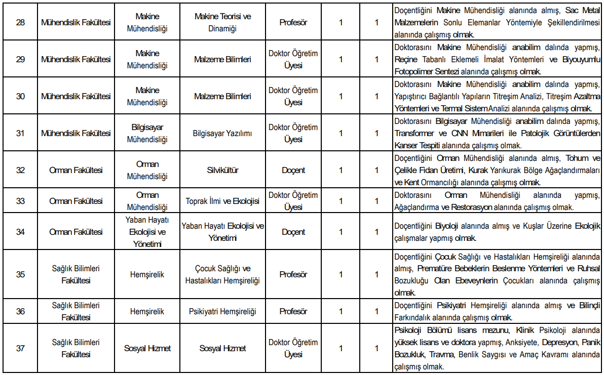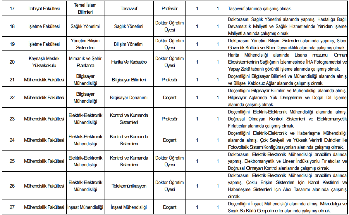 İlahiyat Fakültesi tasavvuf ve din eğitimi alanlarında profesör kadroları açarken, Eğitim Fakültesi öğretim teknolojileri alanında doktor öğretim üyesi alacak. Sağlık Bilimleri Fakültesi ise hemşirelik, çocuk sağlığı, psikiyatri hemşireliği ve sosyal hizmet alanlarında uzman akademisyenler arıyor.