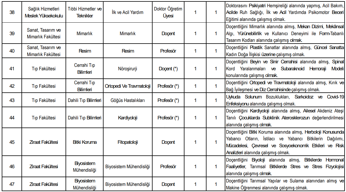 Cerrahi ve dahili tıp bilimlerinde doçent ve profesör kadroları ilan edildi. Çalışma alanları arasında: