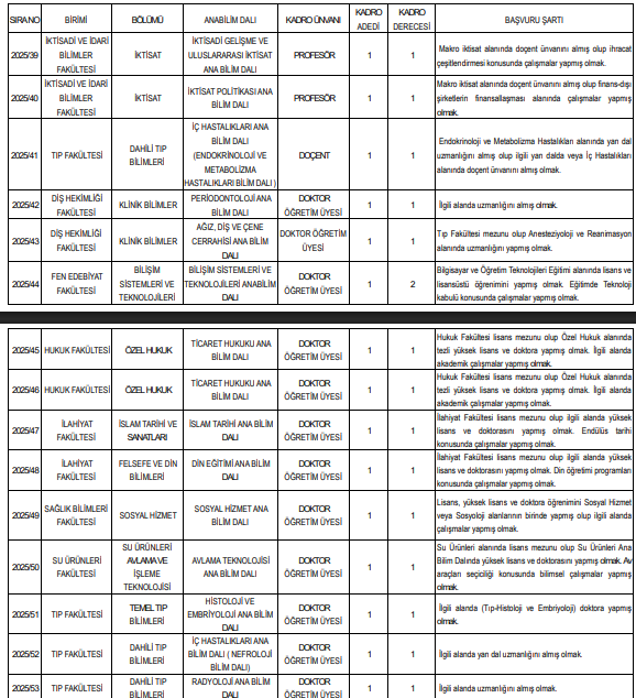 İlanda farklı fakültelerde açılan kadrolar dikkat çekiyor. Öne çıkan bölümlerden bazıları şunlar: