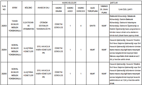Üniversite ayrıca bazı meslek yüksekokullarında öğretim görevlisi kadroları da açtı. Başvurular için ALES ve yabancı dil şartı bölüme göre değişiklik gösteriyor.
