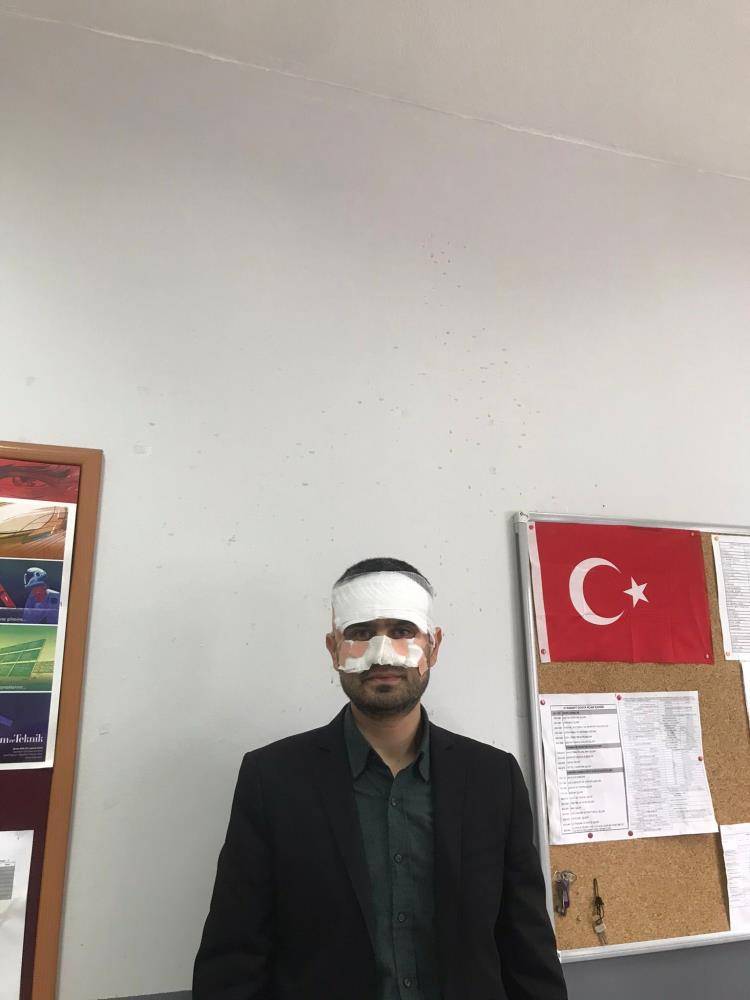 Fizik öğretmeni Serkan Keskinbaş, "Akabinde bana iki tane ağır küfür etti, ağza alınmayacak, Ben kendisine kesinlikle sözlü olarak onun aynı dilinden cevap vermedim. Daha sonra çıkması için şöyle kendisini savurdum. Ondan sonra elindeki sıcak çayı benim yüzüme doğru fırlattı. Bardağı fırlatmadı. Sadece içerisindeki kaynar çayı yüzüme kasıtlı olarak fırlattı ve beni haşladı. Emniyetten de geldiler, fotoğraflar çekildi. Benim odamda komple çay izleri var. Kendisi "Arbede sırasında yaşandı" şeklinde savunmaya geçiyormuş. Ama öyle değil. Beni yaralamaya yönelik ve yüzümü hedef alarak sıcak kaynar çayı yüzüme doğru fırlattı. Çok şok oldum bu durum karşısında" dedi.