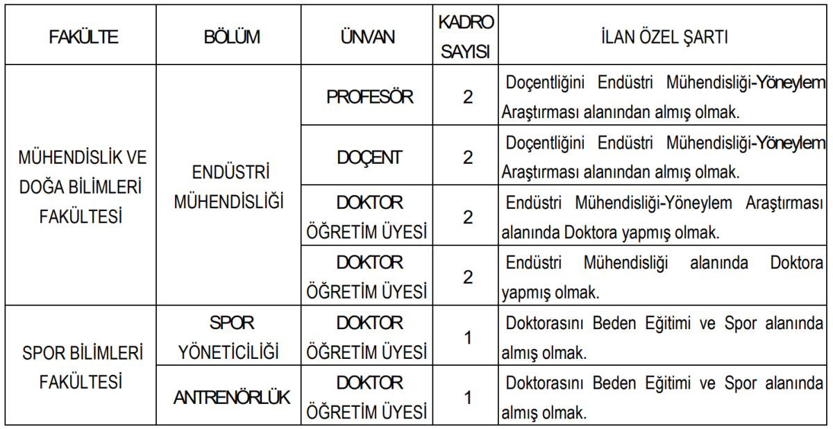 Mühendislik ve Doğa Bilimleri Fakültesi Endüstri Mühendisliği Bölümü için 2 Profesör ve 2 Doçent kadrosu açıldı. Her iki unvan için de doçentlik derecesinin Endüstri Mühendisliği – Yöneylem Araştırması alanından alınmış olması şartı aranıyor.