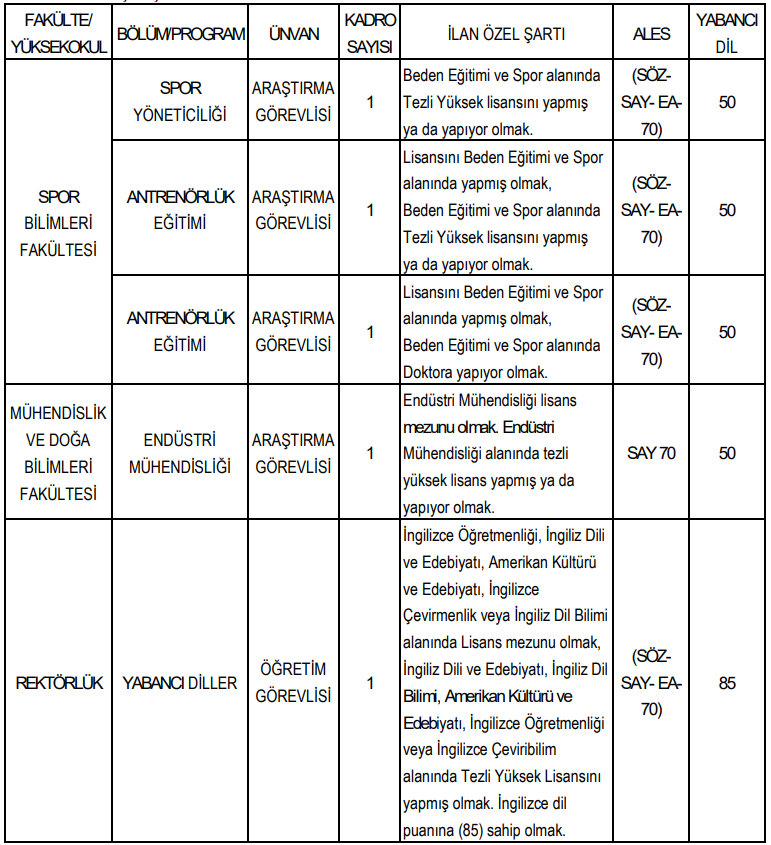 Araştırma Görevlisi kadrolarında ALES puan şartı bulunuyor. Spor Bilimleri Fakültesi kadroları için ALES’ten en az 70 (EA puan türü) ve yabancı dilden en az 50 puan isteniyor.