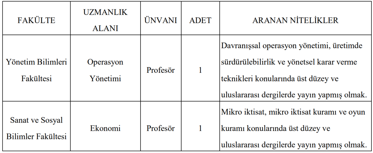 Sanat ve Sosyal Bilimler Fakültesi için ise Ekonomi alanında 1 profesör kadrosu açıldı. Bu kadroya başvuracak adayların;