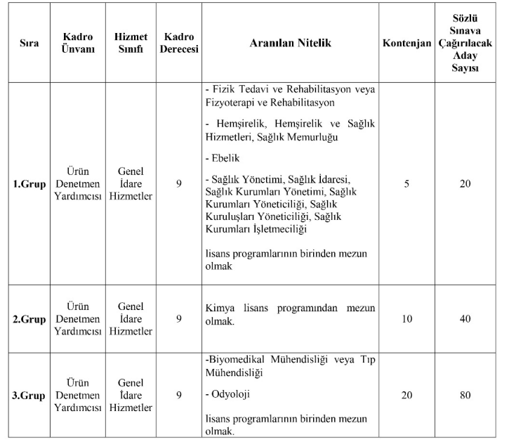 Toplam 35 kadro için yapılacak alımlarda, Ürün Denetmen Yardımcıları Genel İdare Hizmetleri Sınıfı kapsamında, 9’uncu derece kadrolara atanacak. Kontenjanlar öğrenim alanlarına göre üç ayrı grup halinde belirlendi.