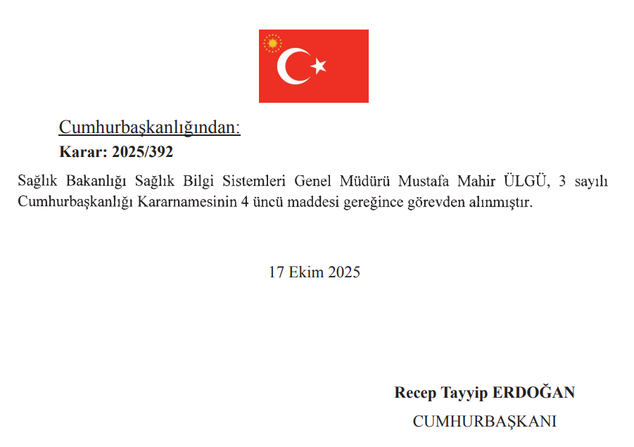 Cumhurbaşkanlığı tarafından yayımlanan 2025/392 sayılı atama kararı ile Sağlık Bakanlığı bünyesinde önemli bir görev değişikliği yapıldı. Resmî Gazete’de yer alan karara göre, Sağlık Bilgi Sistemleri Genel Müdürü Mustafa Mahir Ülgü, 3 sayılı Cumhurbaşkanlığı Kararnamesinin 4’üncü maddesi uyarınca görevden alındı.