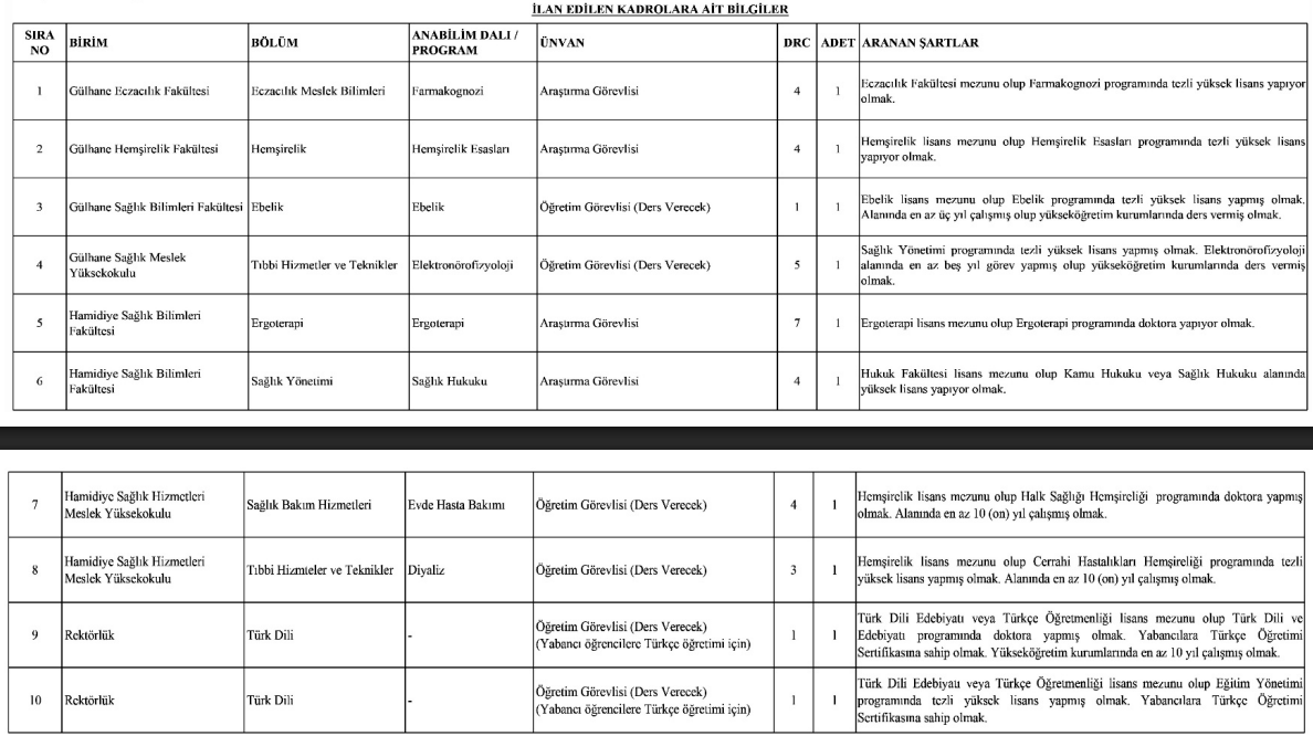 Sağlık Bilimleri Üniversitesi Rektörlüğü, Resmi Gazete’de yayımlanan ilgili yönetmelik hükümleri doğrultusunda öğretim üyesi dışındaki öğretim elemanı alımı yapacağını duyurdu. Yayımlanan ilana göre üniversitenin farklı birimlerinde görevlendirilmek üzere öğretim görevlisi ve araştırma görevlisi kadroları için başvurular alınacak.
