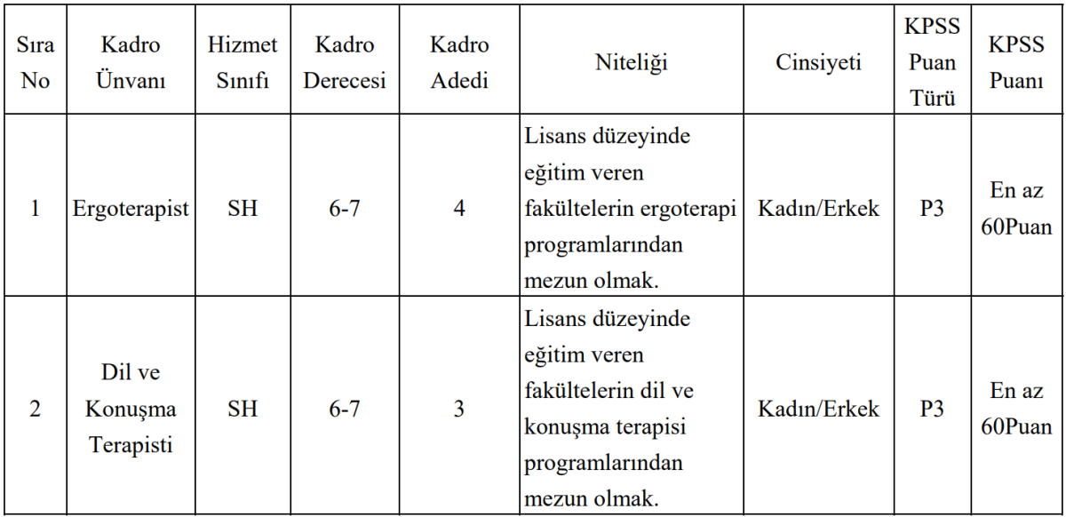 Ergoterapist kadrosuna başvuracak adayların, lisans düzeyinde eğitim veren fakültelerin ergoterapi programlarından mezun olmaları gerekiyor. Dil ve Konuşma Terapisti kadrosu için ise adayların dil ve konuşma terapisi lisans programından mezun olmaları şartı aranıyor.