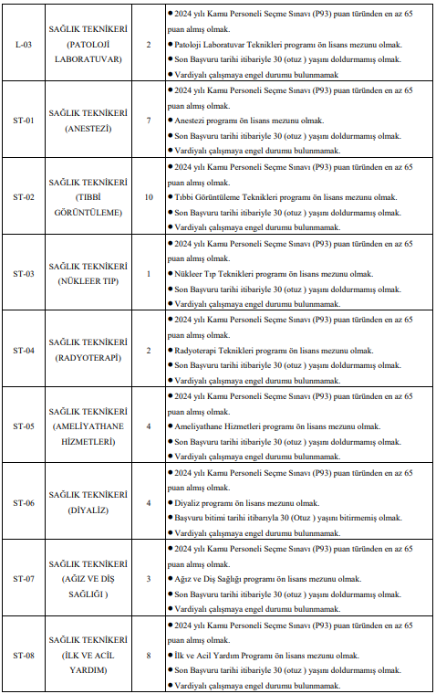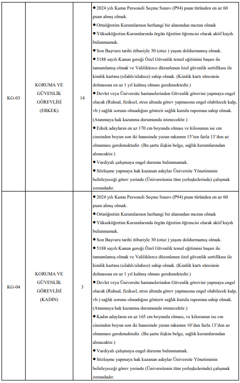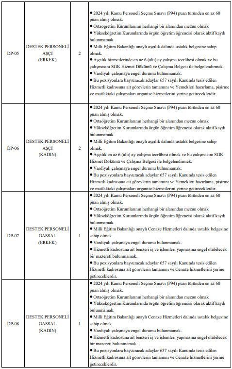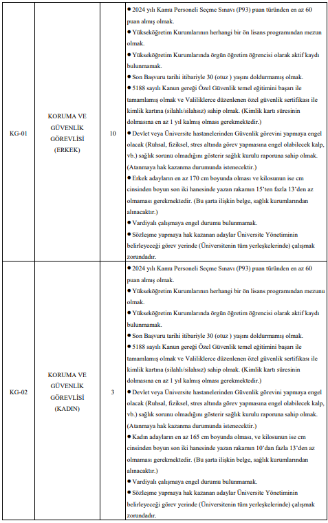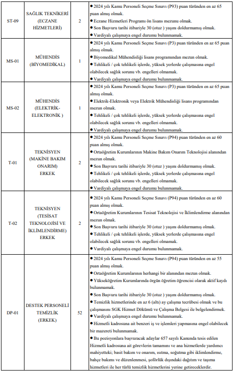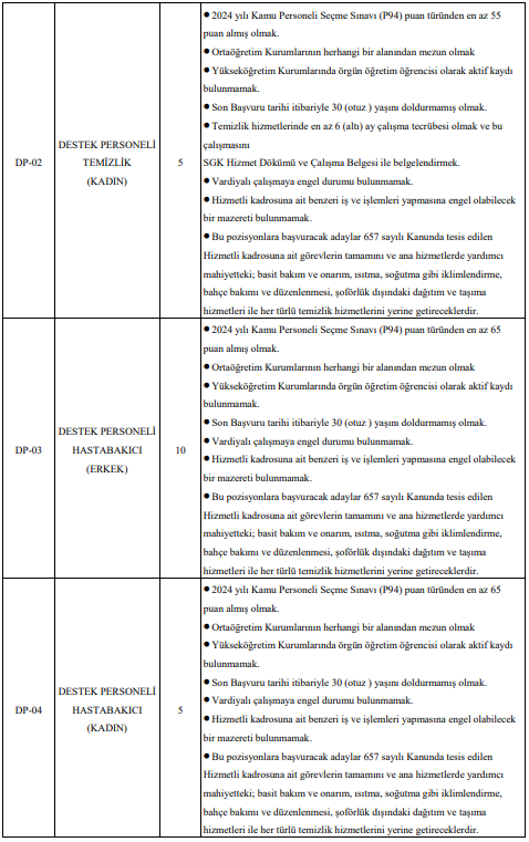 Bunun yanı sıra çok sayıda sağlık teknikeri, laborant, teknisyen, temizlik personeli, hastabakıcı, aşçı, gassal ve koruma ve güvenlik görevlisi alımı da yapılacak. Özellikle destek personeli ve güvenlik görevlisi kadrolarında yüksek kontenjan dikkat çekiyor.