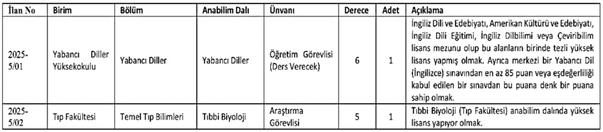 İlan kapsamında öğretim görevlisi ve araştırma görevlisi kadrolarına alımlar yapılacak. Araştırma görevlisi kadroları, 2547 sayılı Kanun’un 50/d maddesi kapsamında istihdam edilecek.