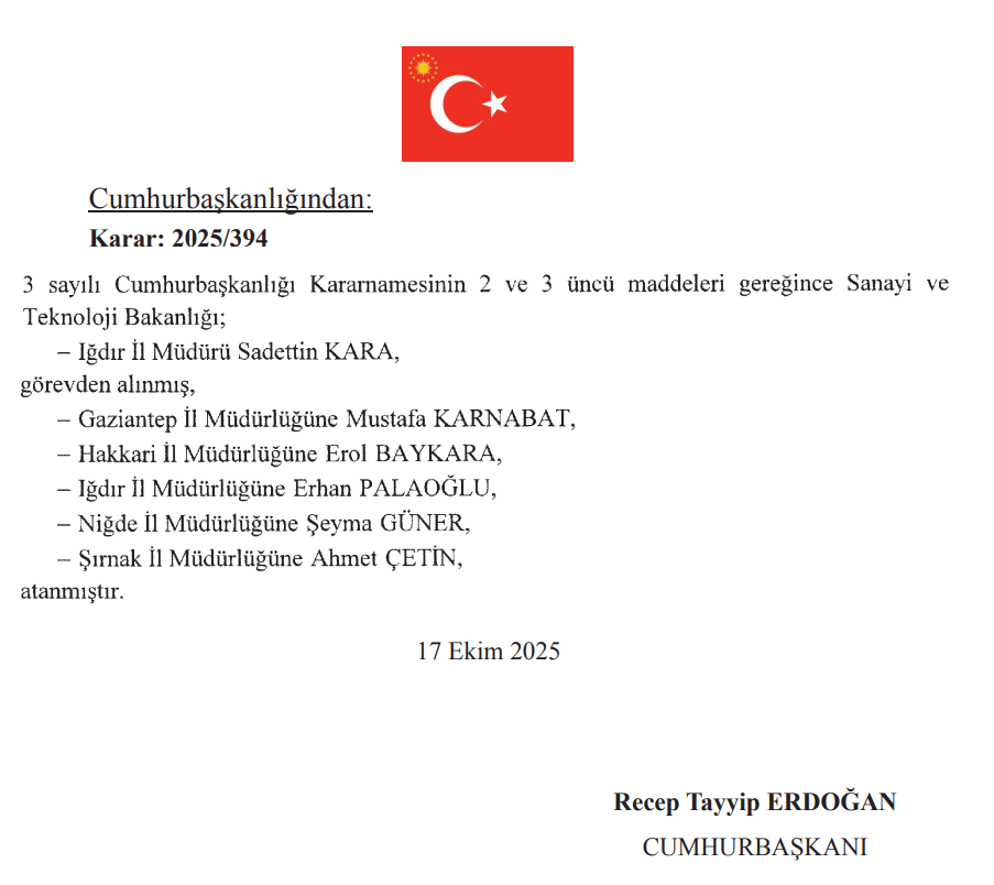 2025/394 sayılı Cumhurbaşkanlığı Kararı ile Iğdır İl Müdürü Sadettin Kara görevden alınırken, Gaziantep, Hakkari, Iğdır, Niğde ve Şırnak İl Müdürlüklerine yeni atamalar yapıldı.