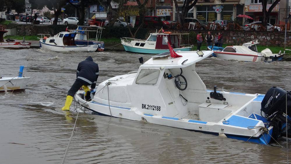 Çanakkale'de son yağışlarla birlikte Atikhisar Barajı'nın su seviyesinin yüzde 100'e ulaşmasının ardından devam eden yağışlar nedeniyle kenti ikiye bölen Sarıçay'da su debisinin yükselmesiyle yer yer taşamalar meydana geldi. Taşan Sarıçay kenarında tekneleri bağlı olan balıkçıların tedirgin bekleyiş sürüyor.