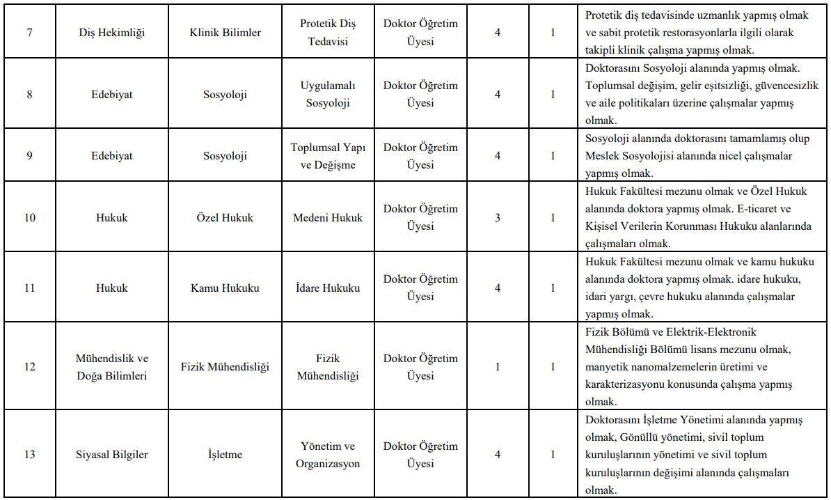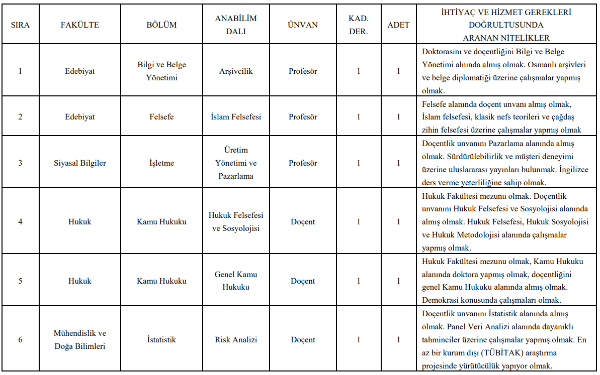 Her kadro için özel olarak belirlenmiş akademik uzmanlık alanları ve çalışma koşulları ilan metninde ayrıntılı şekilde yer aldı.