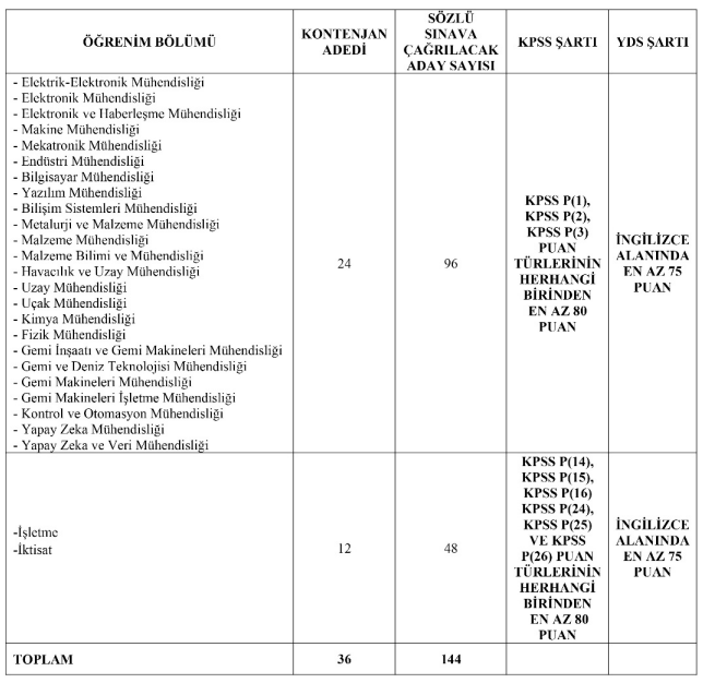 Toplam 36 kadro için giriş sınavı düzenlenecek. Belirlenen kontenjanların 24’ü mühendislik bölümleri için, 12’si ise işletme ve iktisat mezunları için ayrıldı.