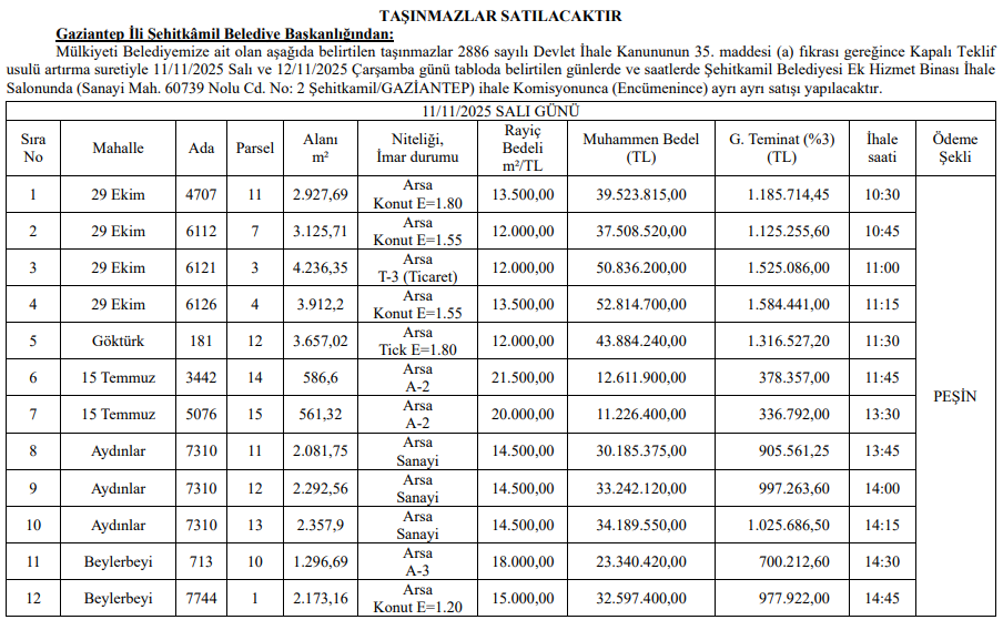 Gaziantep'in hızla gelişen ilçesi Şehitkamil, yatırımcılar için kaçırılmayacak bir emlak fırsatına ev sahipliği yapıyor. Şehitkamil Belediye Başkanlığı, mülkiyetinde bulunan tam 27 adet taşınmazı satışa çıkarıyor. Arsa, Ticaret Alanı, Sanayi Alanı ve hatta dükkan niteliğindeki bu değerli gayrimenkuller, 2886 sayılı Devlet İhale Kanununun 35. maddesi (a) fıkrası gereğince Kapalı Teklif usulü artırma suretiyle yeni sahiplerini bulacak. İhale, 11 Kasım 2025 Salı ve 12 Kasım 2025 Çarşamba günleri, tabloda belirtilen saatlerde Şehitkamil Belediyesi Ek Hizmet Binası İhale Salonu'nda gerçekleştirilecek.