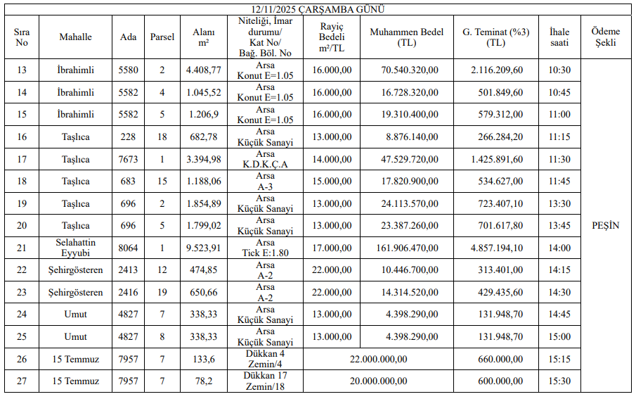 Bu günkü listede İbrahimli, Taşlıca, Selahattin Eyyubi, Şehirgösteren ve Umut Mahallelerinden konut, küçük sanayi, ticaret ve arsa niteliğindeki gayrimenkuller yer alıyor.