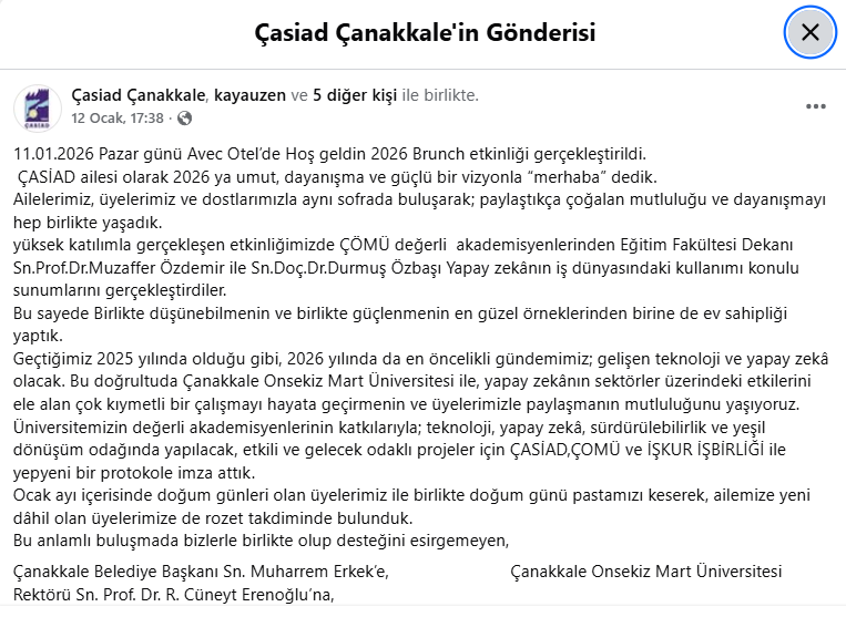 Çanakkale'nin "kaymak tabakası" olarak bilinen iş dünyasının çatı örgütlerinden ÇASİAD hafta sonunu lüks bir otelde "brunch" yaparak geçirdi. Üyelerin aileleriyle katıldığı, arkada "Çalışma Hayatında Yapay Zeka" sunumlarının döndüğü, önde ise çatalların bıçakların konuştuğu organizasyon, derneğin resmi hesaplarından paylaşılan fotoğraflarla bir "halkla ilişkiler kanalizasyonuna" dönüştü.