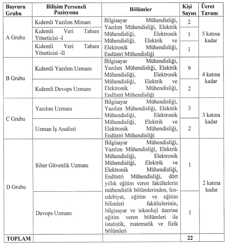Alternatif olarak, mühendislik fakülteleri, fen-edebiyat, eğitim fakültelerinin bilgisayar/teknoloji bölümleri ile istatistik, matematik ve fizik mezunları yalnızca D Grubu pozisyonlarına başvurabilecek.