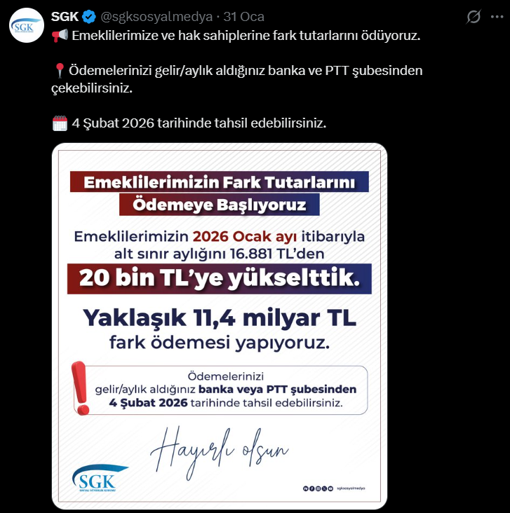“Emeklilerimize ve hak sahiplerine fark tutarlarını ödüyoruz. Ödemelerinizi gelir/aylık aldığınız banka ve PTT şubesinden çekebilirsiniz. Fark ödemeleri 4 Şubat 2026 tarihinde yapılacaktır.”