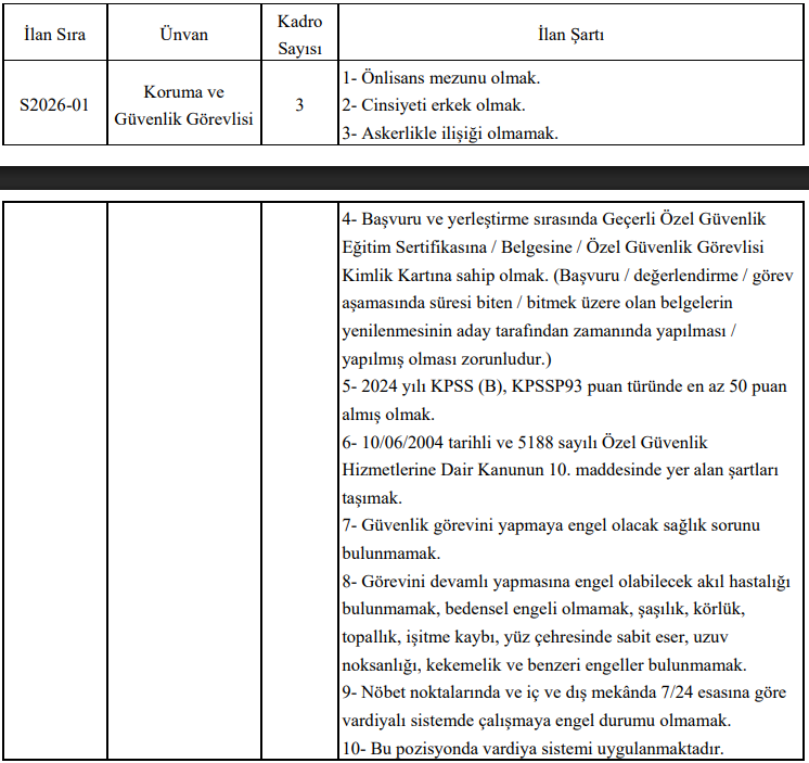 İlanda belirtilen diğer şartlar arasında görev sırasında vardiyalı çalışma sistemine uygunluk da bulunuyor. Güvenlik görevlileri üniversite kampüslerinde 7 gün 24 saat esasına göre vardiya düzeninde görev yapabilecek.
